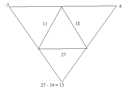 by 2 (yielding 27 in the original puzzle). She then writes this in the center of the triangle (see Figure 40). Subtracting each of the known sides from this number yields the secret number on the corner across from it.