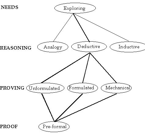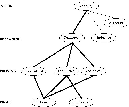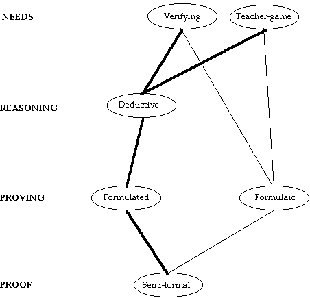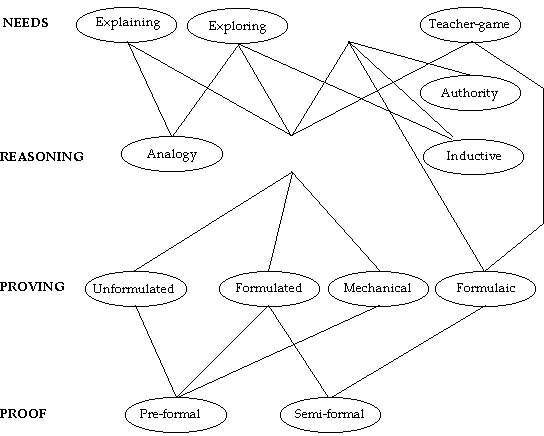 The relationships between needs, reasoning, proving, and proofs can now be gathered together in a single network. An episode of reasoning connects a need with a way of reasoning and if the reasoning is deductive, the connection continues down through a kind of proving and a type of proof (see Figure 23).
