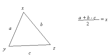 Rachel then explored the case of all the known sides being equal. When she completed her deductions, the observer closest to her, Tom, suggested that she explore the situation without putting any constraints on the situation. With a few hints from Tom she then derived a general formula, x = -> , for an unknown corner.