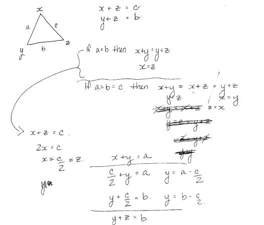 For the first half hour of the session, Rachel engaged in activities similar to those of the others. She solved the original puzzle by using a system of equations, she tried solving other triangles, she experimented with Ben’s constraints method, and she searched for patterns inductively. In the second half hour of the session, however, she worked by herself, or with the help of an observer, Tom Kieren, using formulated proving to explore. Her first exploration was of the situation in which two of the known sides are equal. By working with the known relations she was able to deduce that two of the corners would be equal in that case (see Figure 16). After she came to this conclusion, she described her work to the others MAT episode 8). This description may have inspired Eleanor’s explorations by formulated proving (see below).