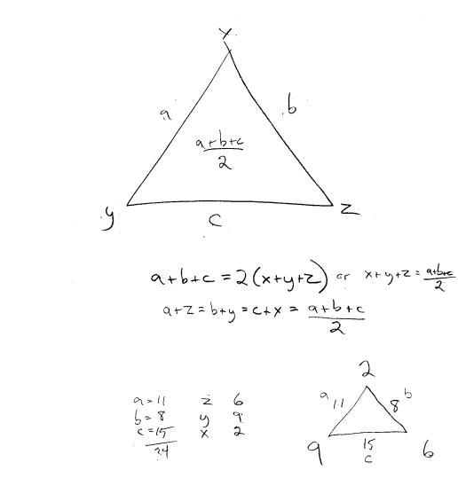 While Rachel was exploring the Arithmagon situation modified by various conditions, Eleanor was working with Ben and Wayne. Together they found inductively the relations a+z = b+y = c+x and a+b+c = 2(x+y+z) (see Figure 17). Eleanor then worked independently, trying to invent a general method of solution based on these relations (MAT episodes 11-13). Her work was interrupted on several occasions but she did manage to develop an alternative solution method to Rachel’s. Her method involves finding the sum of the three sides (34, in the example shown in Figure 17), and dividing by 2 (17 in her example, but not shown). This calculation gives her “middle number,” (note the expression in the middle of the upper triangle). Because the sum of a side and the corner opposite is this middle number, the corner numbers are obtained by subtracting across the triangle (e.g., 17–11=6).