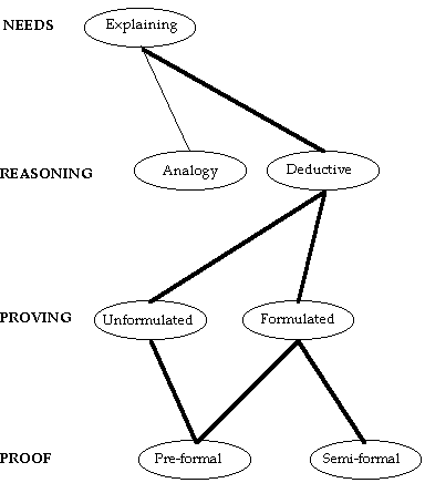 Explaining provided a definite need to prove for the participants in my studies, but proving was not the only sort of reasoning motivated by a need to explain. Reasoning by analogy was also used to explain and was preferred to proving in some cases. In addition, I observed significant differences in the formulation of their proving. In Figure 5 the paths involving explaining in the network are shown. Those involving proving are shown by thick lines. The three remaining stages of the network appear for the first time in this figure. The second stage includes different types of reasoning. The third distinguishes proving by the degree of formulation involved in it. The fourth stage differentiates between proofs, on the basis of the formality of their presentation. In the following examples and discussion of these paths the distinction between “formulated” and “unformulated” proving will be clarified. Pre-formal proofs, described above in Chapter I, section 1, will be elaborated upon, and illustrated with examples. At the end of this section examples of explaining by analogy will be discussed and contrasted with explaining by proving. In the following section the network will be extended, as new nodes in each stage are discussed.