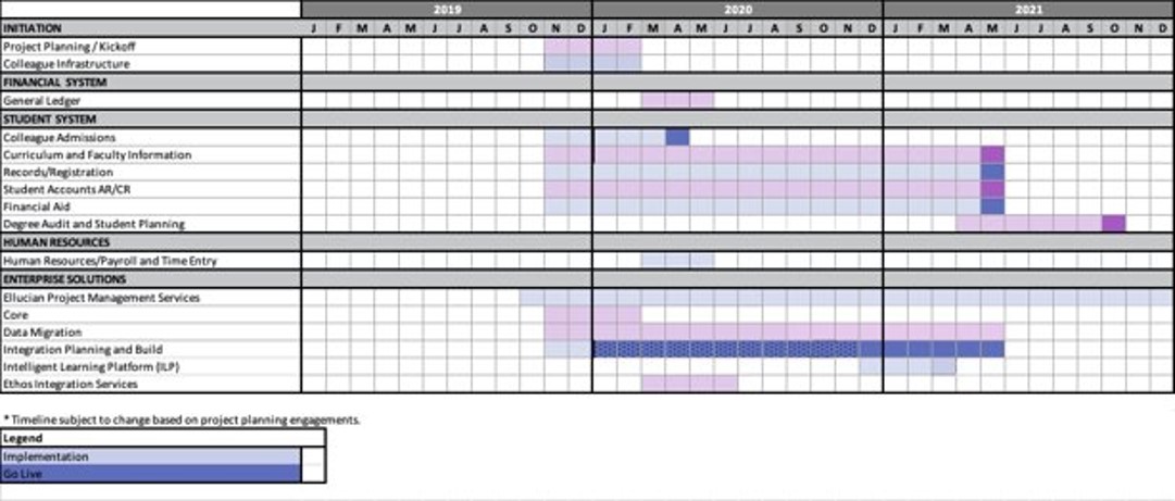This is the draft schedule for the overall transformation to the Colleague Student system from our implementation vendor, Ellucian. These dates are subject to change but give everyone an idea of what is to come and when.